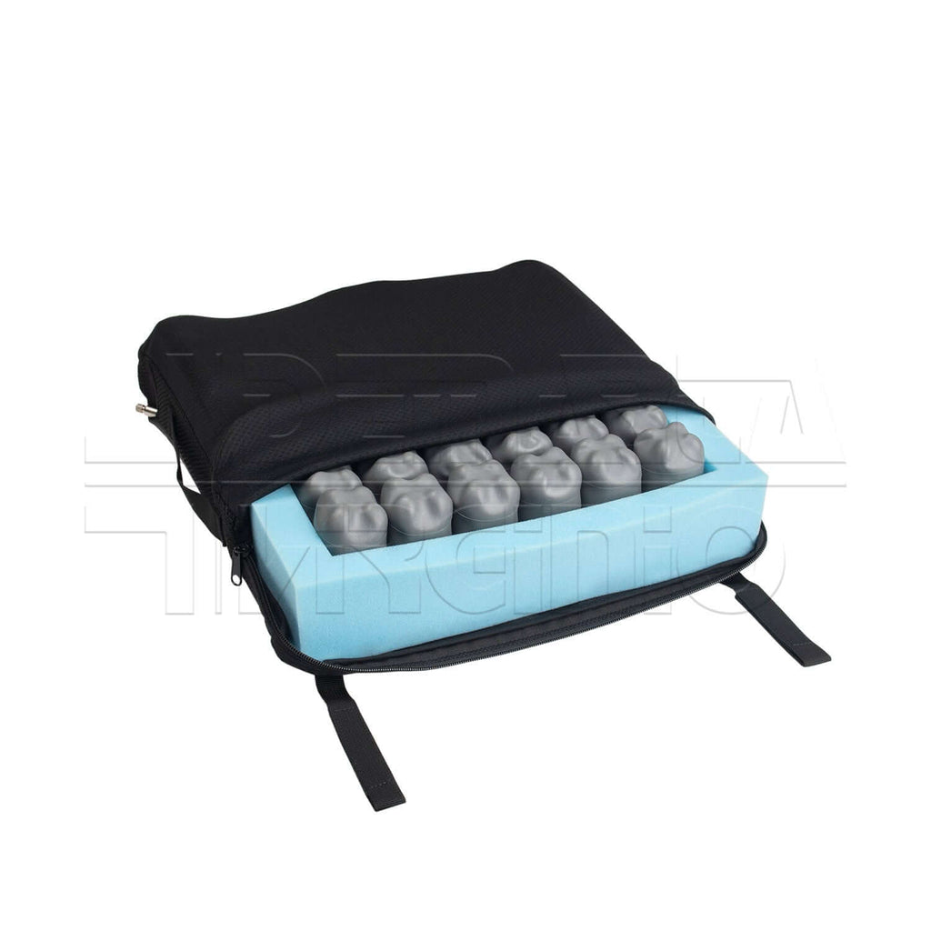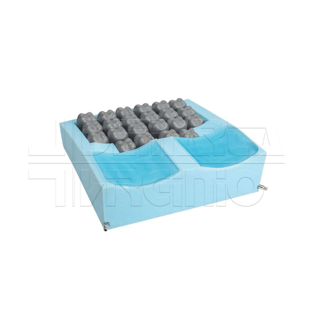 Il cuscino posturale 3 ELEMENTS è composto da una base anatomica in espanso; la zona ischiatica è composta da 22 bolle d'aria a micro-interscambio, due valvole per il gonfiaggio.