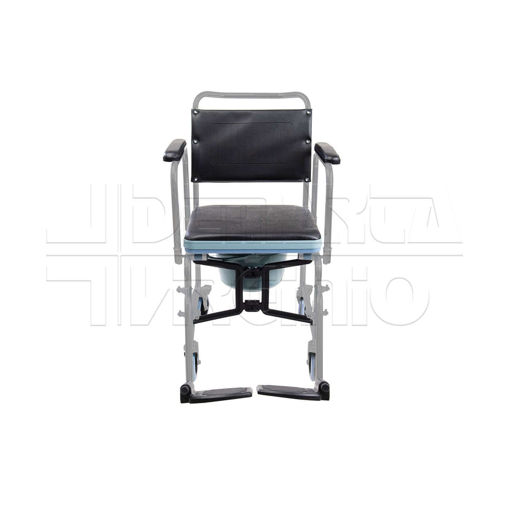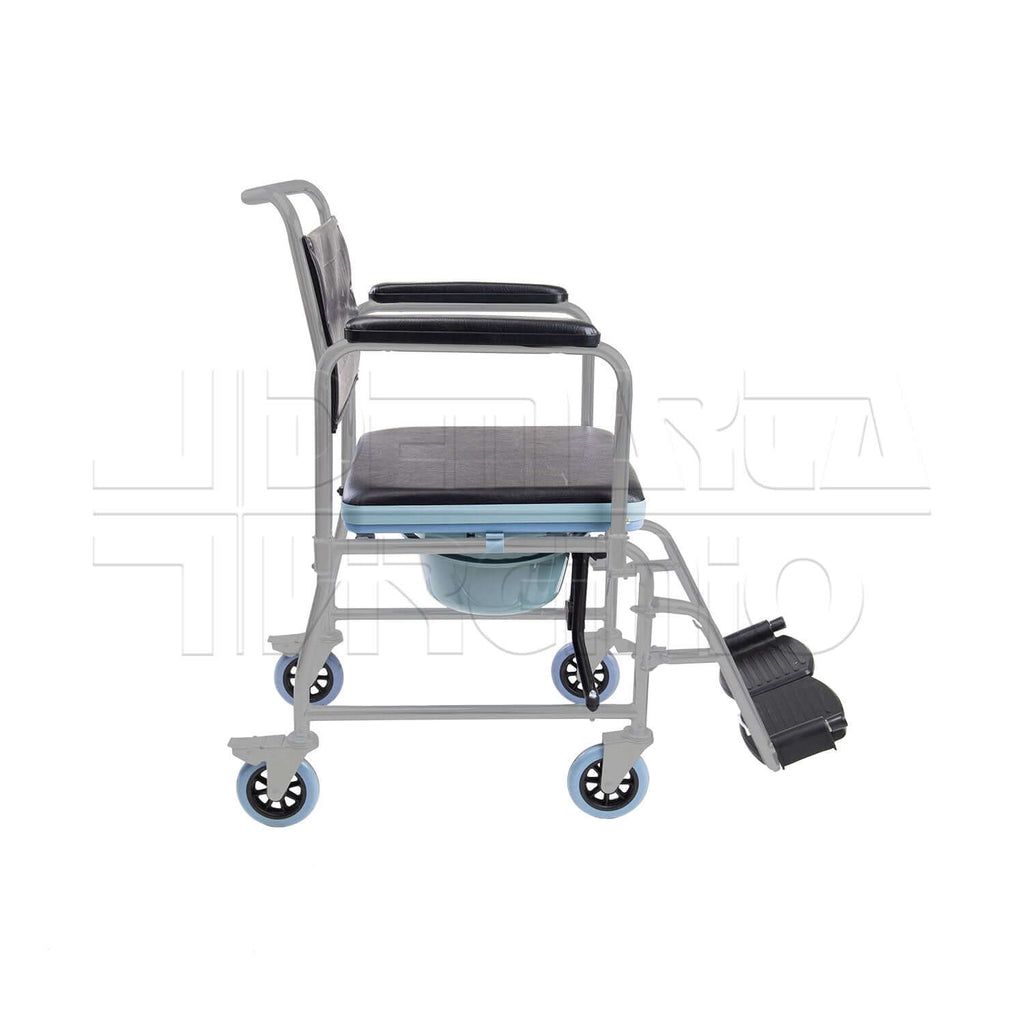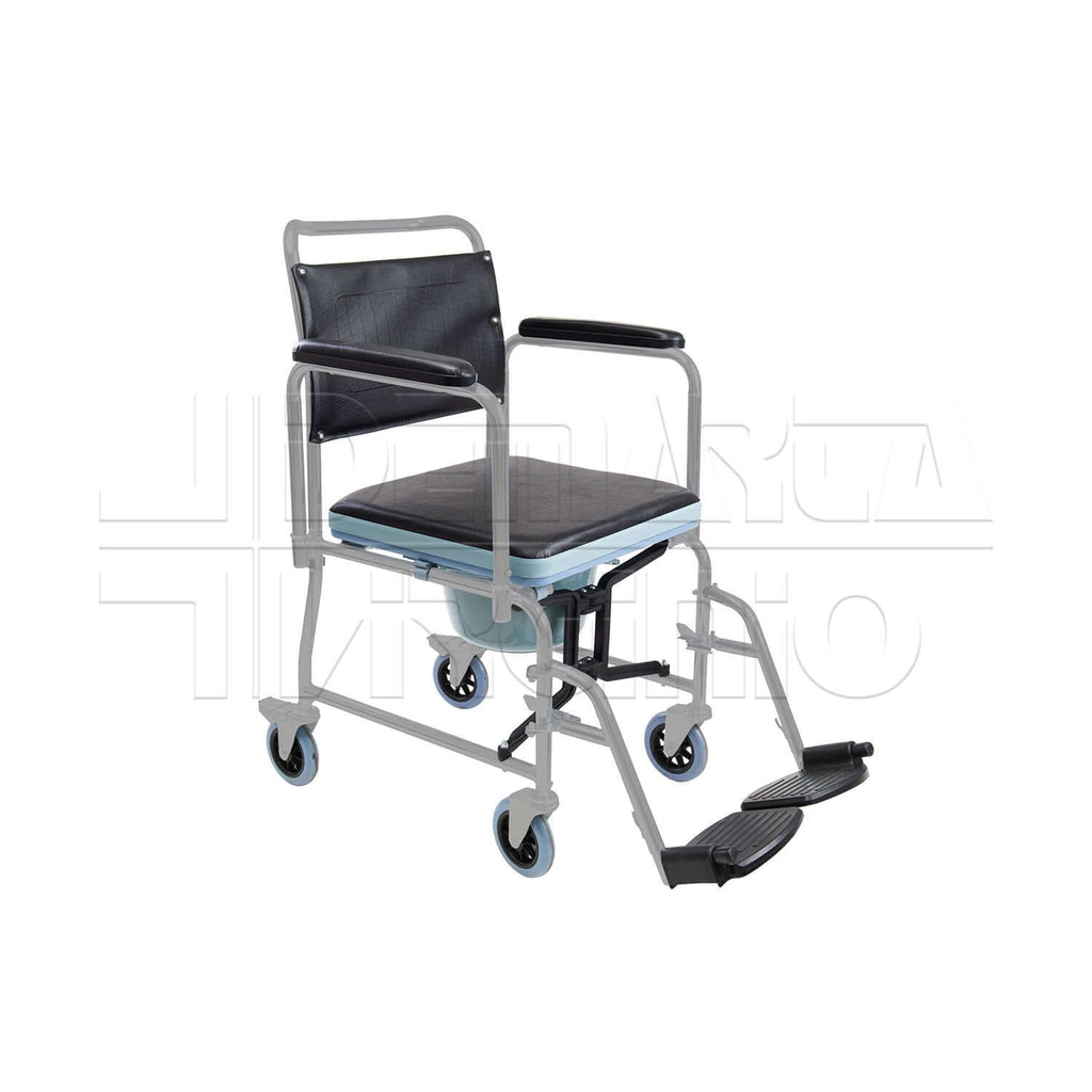 Telaio pieghevole in Acciaio Seduta: Imbottita Tappo di Chiusura del Sedile Wc: Rimovibile Vaschetta Wc: PVC Ruote Anteriori: 12,50 cm Ruote Posteriori: 12,50 cm Braccioli: Ribaltabili con Poggiabraccio in PVC Pedane: Estraibili con Supporto per Gambe Poggiapiedi: PVC Nero Materiale Rivestimento: Lavabile ed Ignifugo ISO DM332/99: 12.21.03.003 ISO DPCM 12.01.2017: 09.12.03.006 CND: Y091203 RDM: 2490845/R