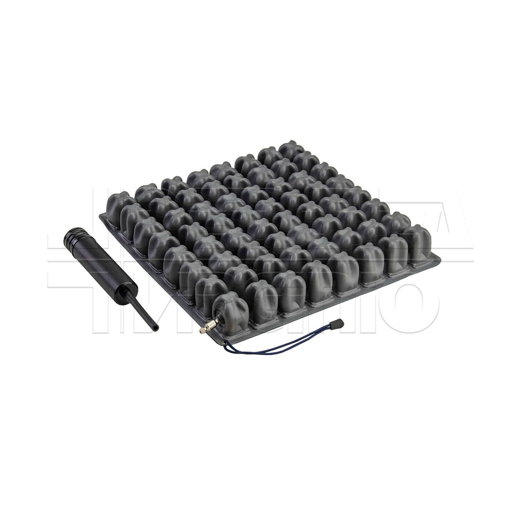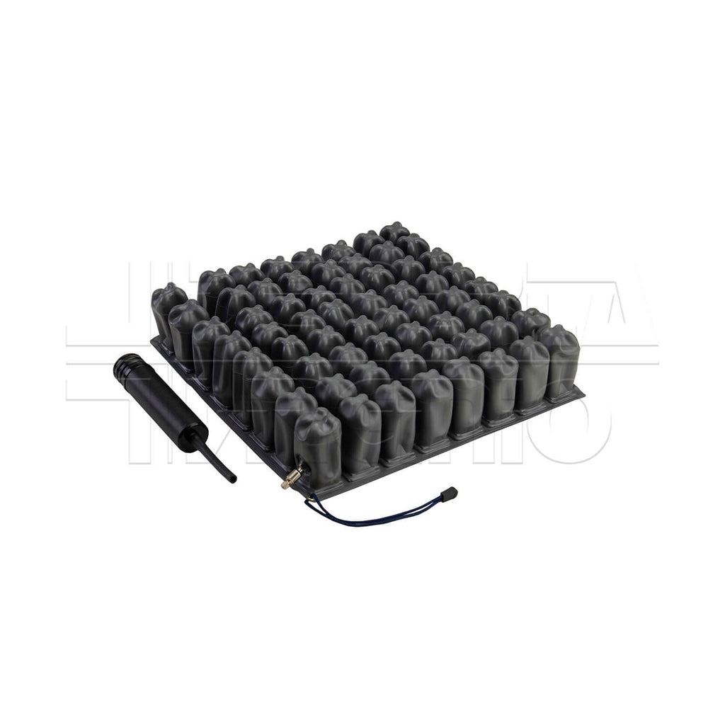 CUSHION AIR AD UNA VALVOLA è un cuscino a bolle d'aria con struttura a micro-interscambio. È realizzato in PVC impermeabile all'aria per assicurare il mantenimento di una pressione costante all'interno. È disponibile in altezza 6 o 10 cm. La fodera esterna è caratterizzata da una superficie d'appoggio in Jersey, poliestere traspirante e bielastico; una struttura a nido d'ape sui fianchi, una base antiscivolo, maniglia per il trasporto, cerniera su 3 lati e laccetti per l'ancoraggio alla carrozzina.