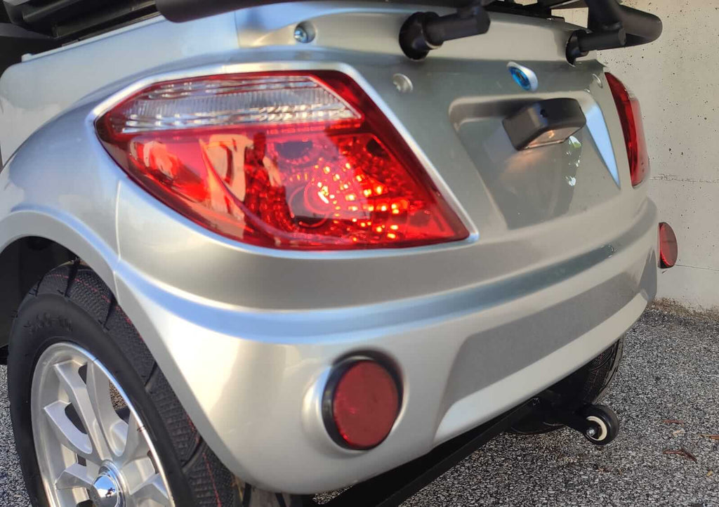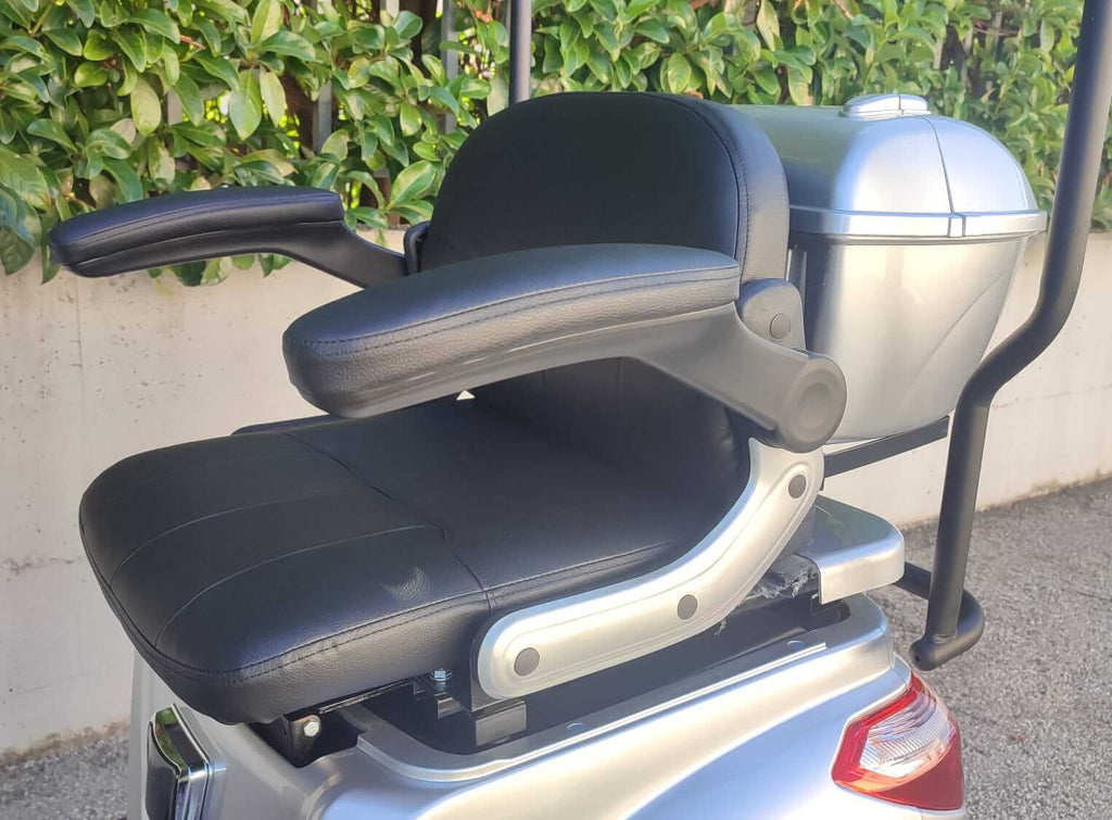 La guida è resa comoda e sicura grazie a tre modalità di velocità selezionabili, alla retromarcia con segnale acustico, ai freni a disco idraulici anteriori e tamburo posteriori e alla presenza di rotelle stabilizzatrici che migliorano l’equilibrio del mezzo.