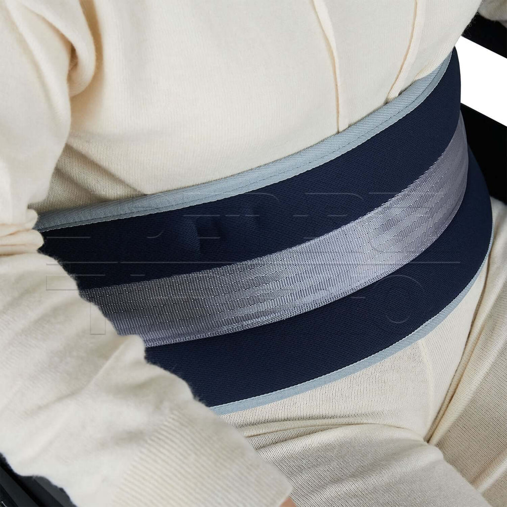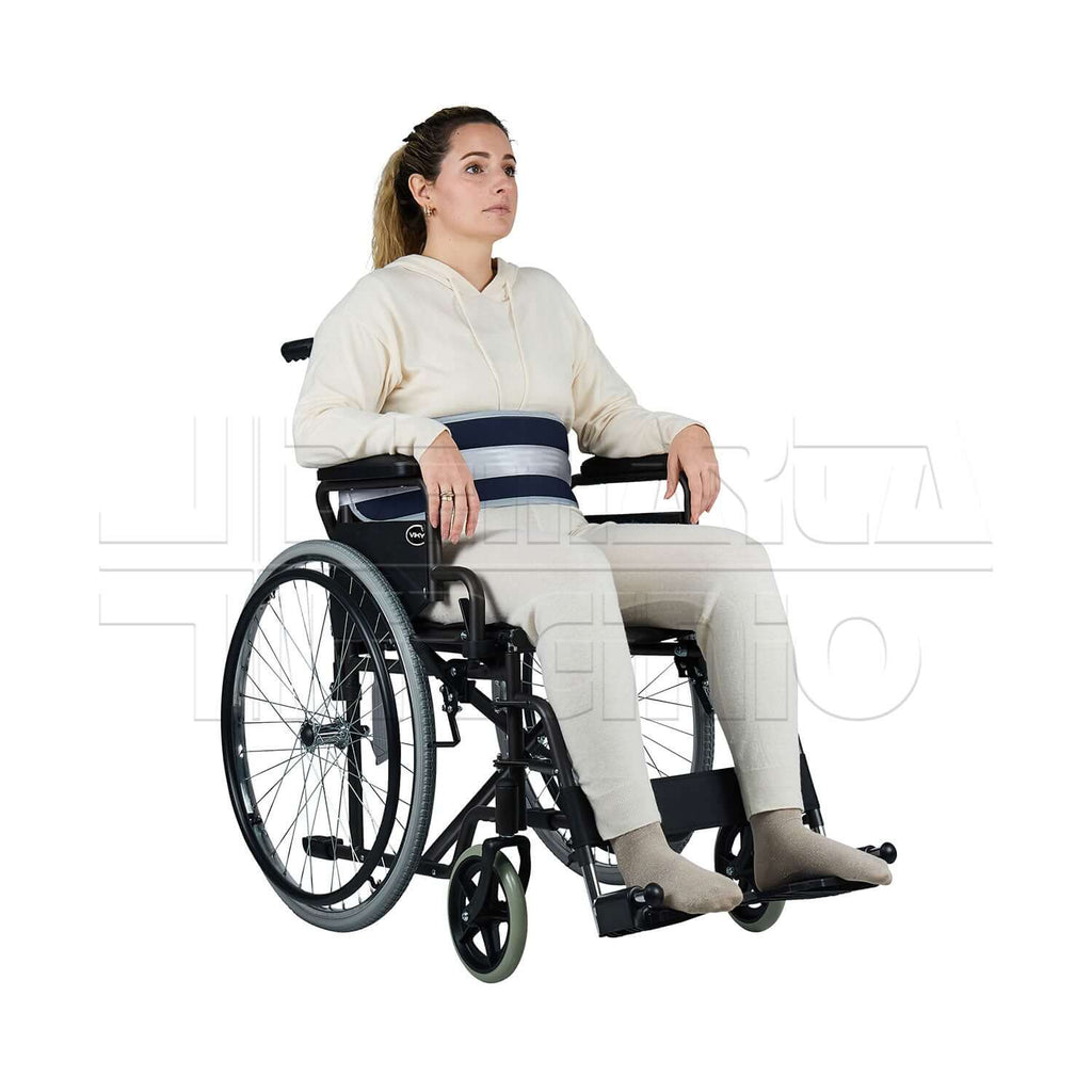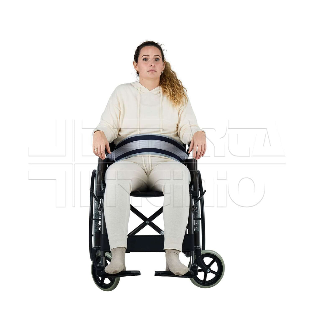 La CINTURA ADDOMINALE viene utilizzata per fissare il paziente alla sedia a rotelle. Offre così stabilità del tronco evitando movimenti laterali e lo scivolamento del paziente verso il pavimento. Grazie al suo design si adatta a qualunque struttura corporea dell'utilizzatore.
