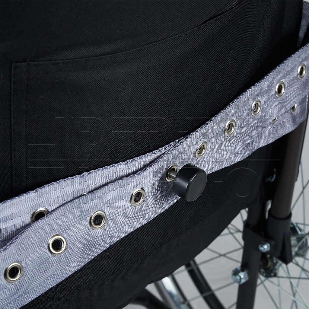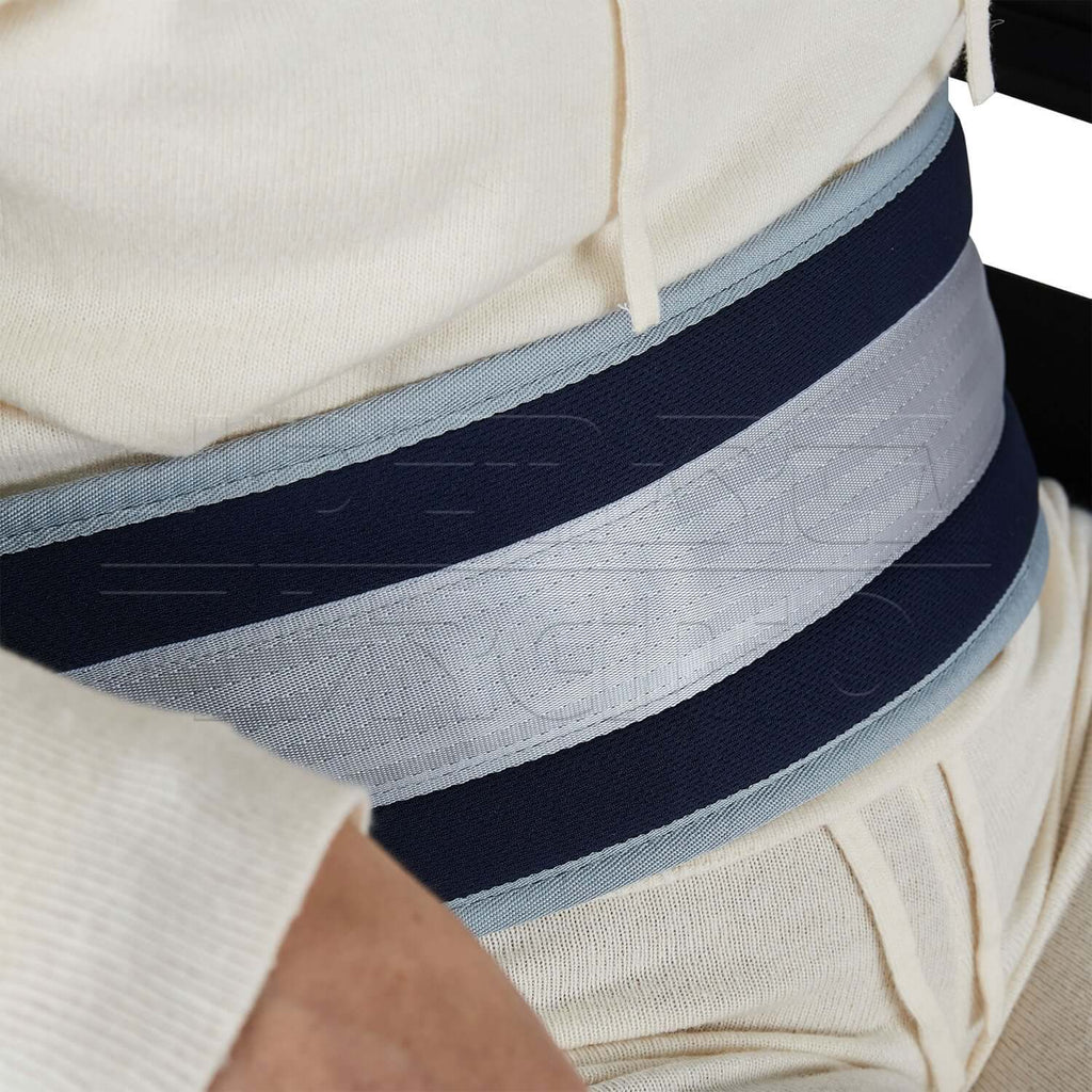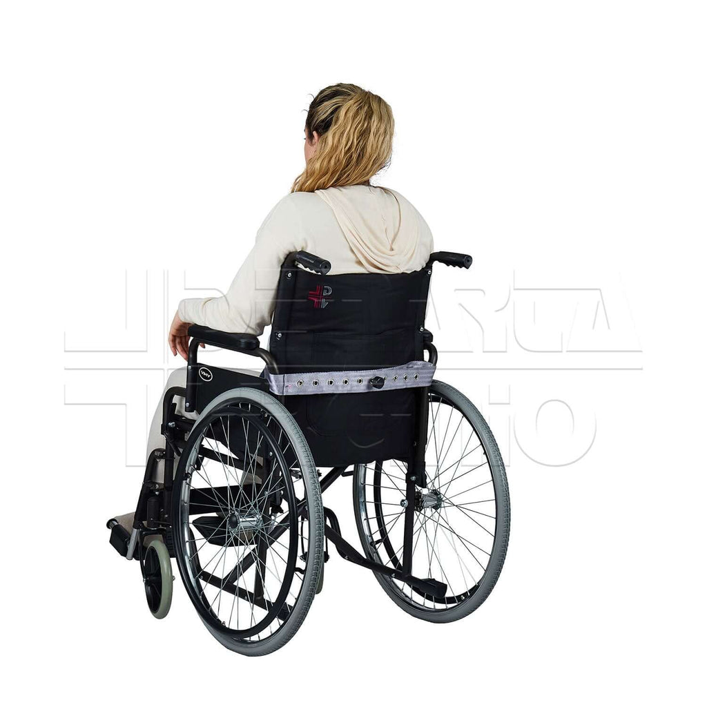 La CINTURA ADDOMINALE viene utilizzata per fissare il paziente alla sedia a rotelle. Offre così stabilità del tronco evitando movimenti laterali e lo scivolamento del paziente verso il pavimento.