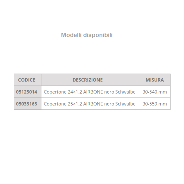 | 05125014 | Copertone 24x1.2 AIRBONE nero Schwalbe | 30-540 mm |