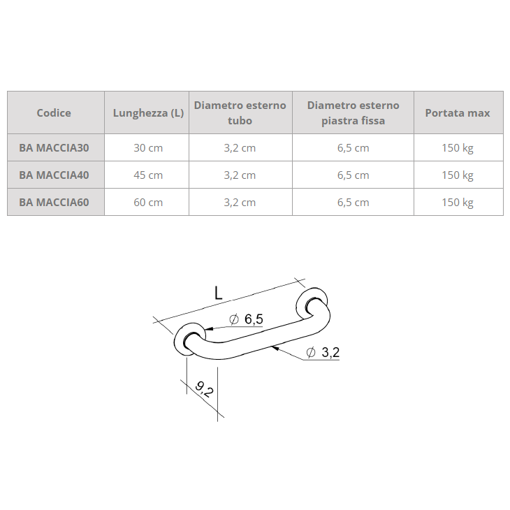 | BA MACCIA30 | 30 cm | 3,2 cm | 6,5 cm | 150 kg |