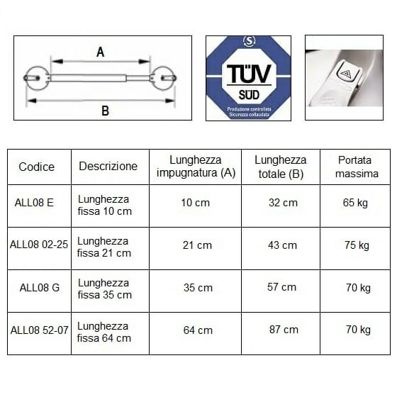 | Codice articolo | Descrizione | Lunghezza impugnatura (A) | Lunghezza totale (B) | Capacità massima |
