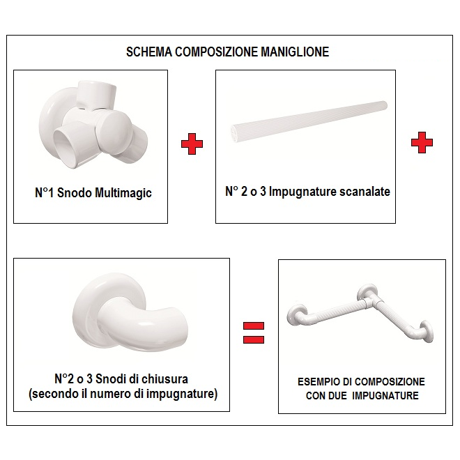 Assemblando queste impugnature attraverso lo snodo Multimagic è possibile adeguare il maniglione alle caratteristiche presentate dall'ambiente da adattare e soddisfare le esigenze dell’utente.