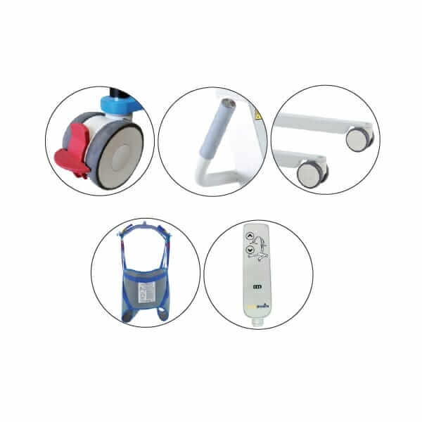 Il sollevatore viene fornito di serie con una morbida imbragatura dotata di ganci flessibili, cinghie regolabili, con maniglie di presa utilizzabili dal caregiver, chiusura in velcro. Realizzata in materiali confortevoli, con cuciture di elevata qualità disponibile nella misura MEDIA e LARGE.