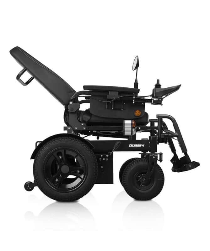 La carrozzina elettrica Calabria 4 e molto riconoscibile per la sua struttura in alluminio compatta, moderna ed ergonomica. Ha un sistema di reclinazione manuale e i poggiapiedi sono pieghevoli. e molto sicuro grazie al suo telaio fisso e robusto.