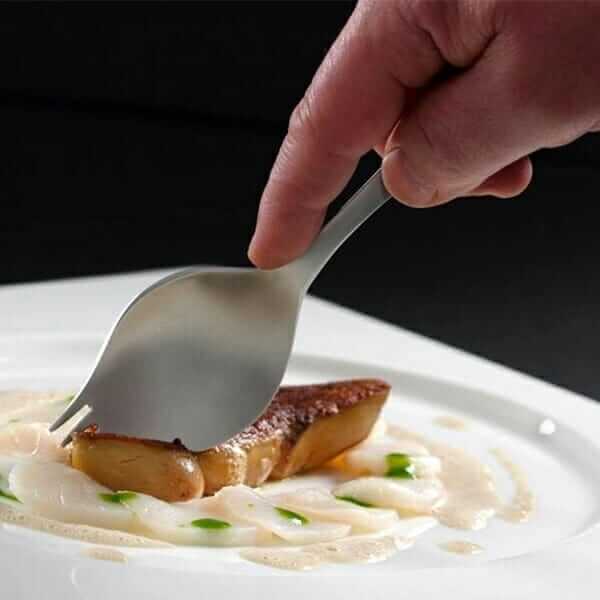 La Forchetta - Cucchiaio 3 in 1 Allmobility, grazie al particolare design ed al bordo affilato, può essere anche impiegata per la separazione del cibo.