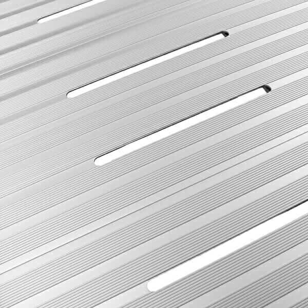 Questo tipo di rampa per soglie è dotata di una superficie ad alto grip e fascia antiscivolo nella sezione a contatto con il dislivello da superare.